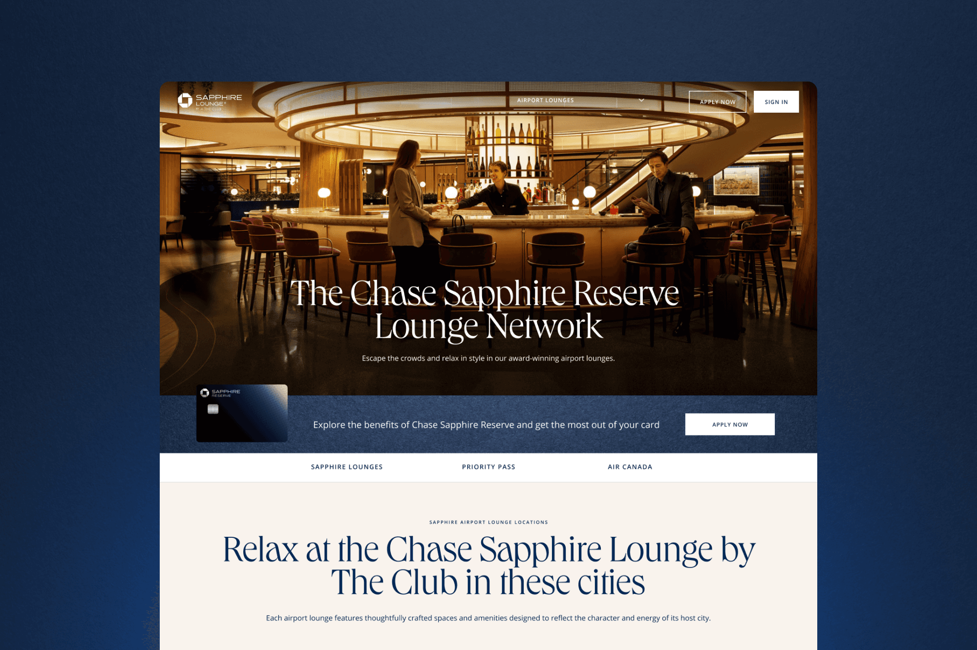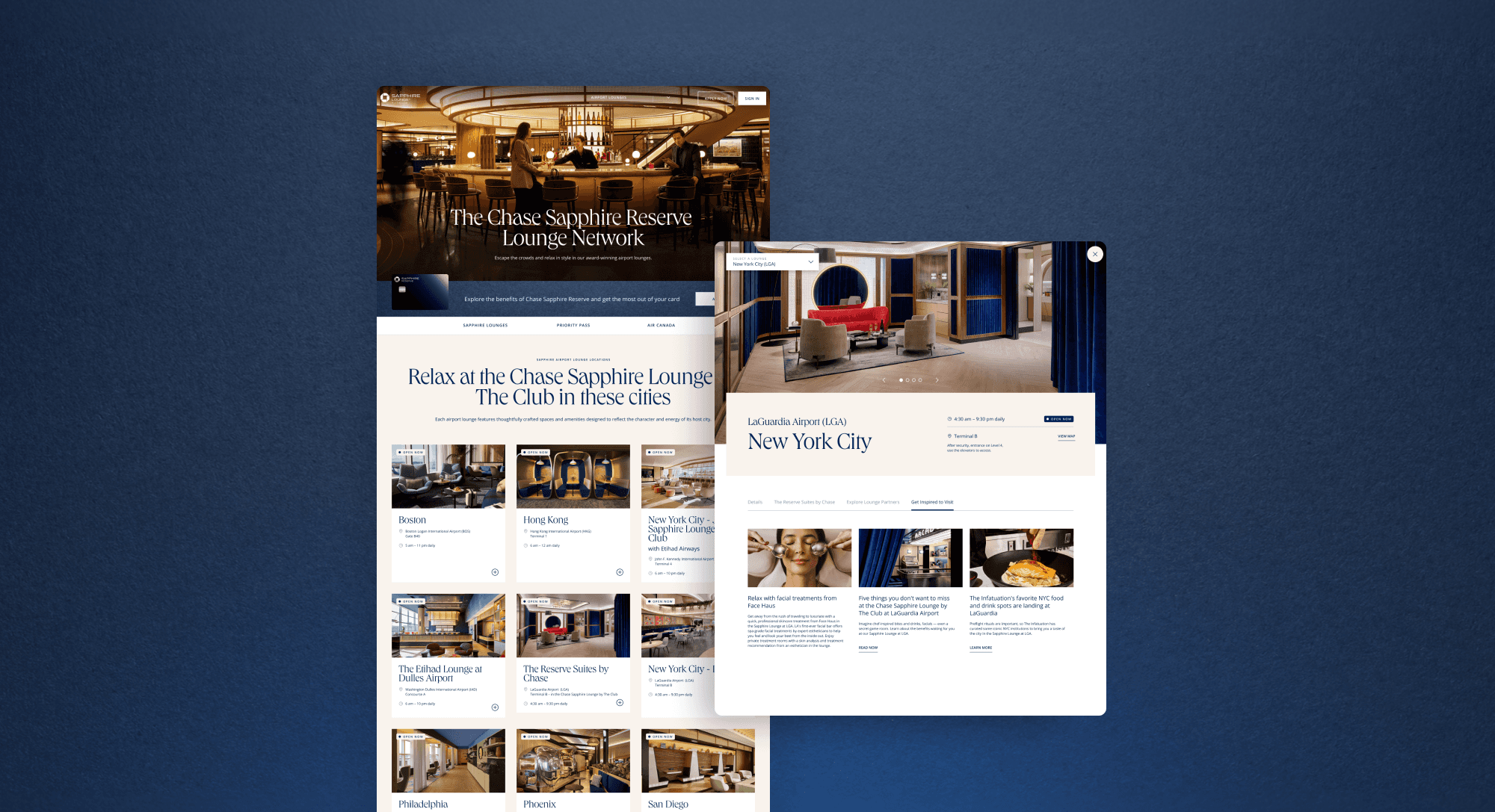On the Sapphire landing page, benefits were organized into a clear hierarchy to guide prospects toward what mattered most to them. The Airport Lounge pages were built mobile-first for travelers on the go, letting them instantly check lounge availability at their airport and surface the details they needed.